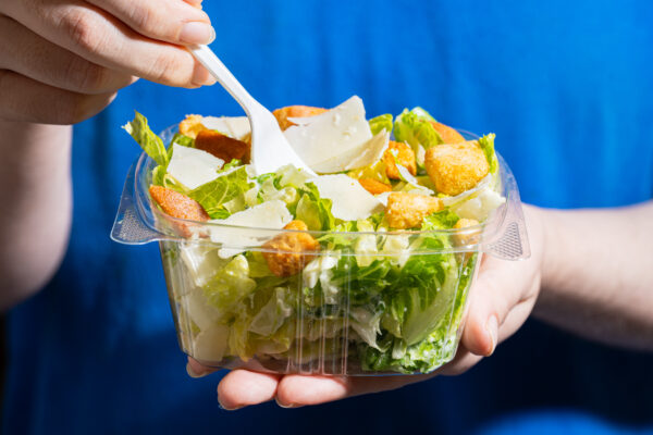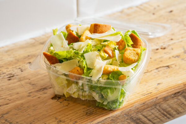 Crisp romaine lettuce topped with shaved Parmigiano and garlic butter croutons. Comes with a side of Caesar dressing.