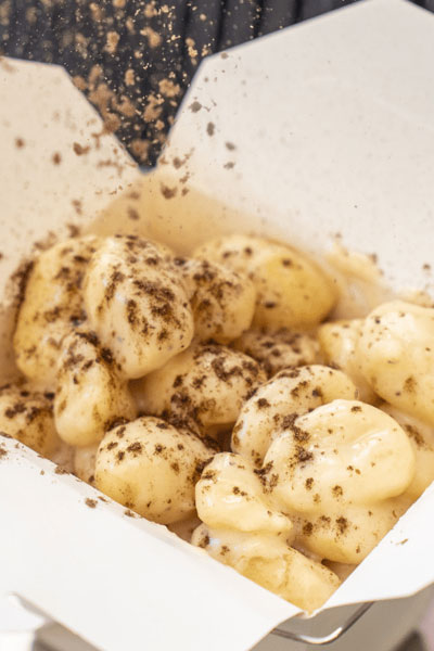 Gnocchi in a creamy pecorino and toasted black pepper sauce, finished with ground black truffle. A luxurious twist on an Italian favorite. (V)