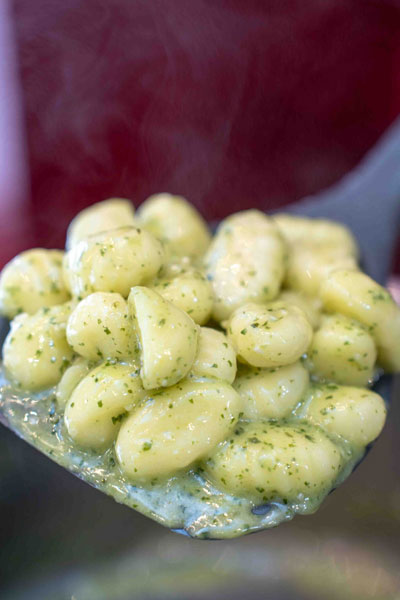 Gnocchi in a vibrant, basil pesto sauce. A light and delicious burst of flavor. (V)