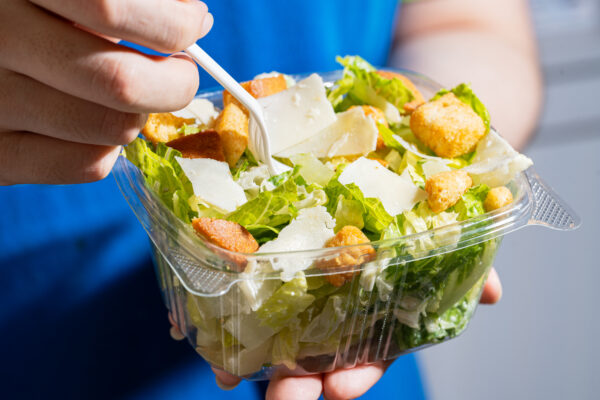 Crisp romaine lettuce topped with shaved Parmigiano and garlic butter croutons. Comes with a side of Caesar dressing.