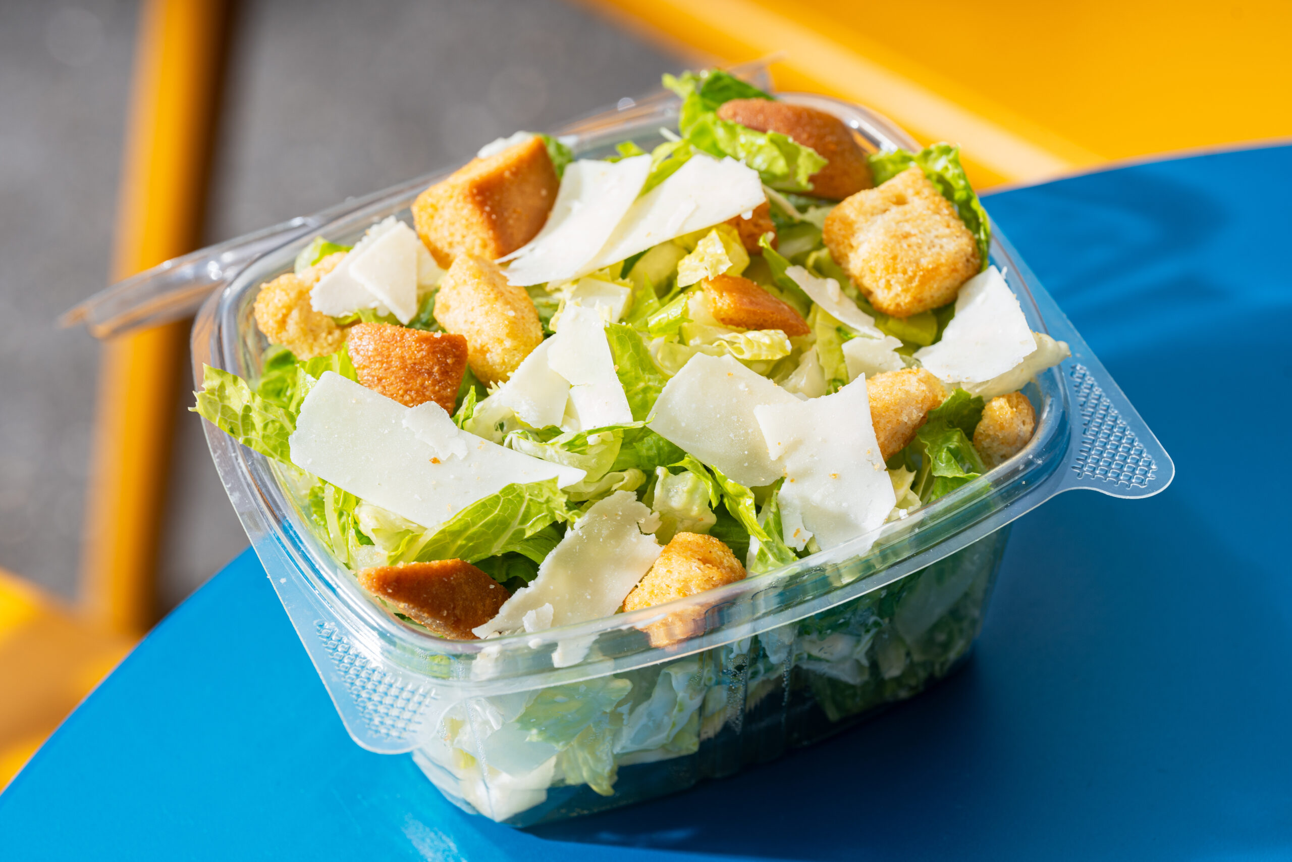 Crisp romaine lettuce topped with shaved Parmigiano and garlic butter croutons. Comes with a side of Caesar dressing.